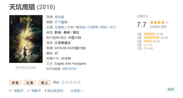 根据天下霸唱同名小说改编,由成志超担任总导演,王俊凯、文淇领衔主演、蒋依依特别主演,郑好、叶筱玮等联袂主演的英雄少年探寻自然励志剧《天坑鹰猎》,从上映到现在该剧播放量达到5亿次,豆瓣评分高达7.7分,可谓是延续了天下霸唱的小说改编影视剧的一贯风格也就是“低播放量与高口碑的结合”,而且更是受到了传统媒体的关注。据悉《天坑鹰猎》也将在9月25日在东方卫视深夜档进行1.5轮的播放!